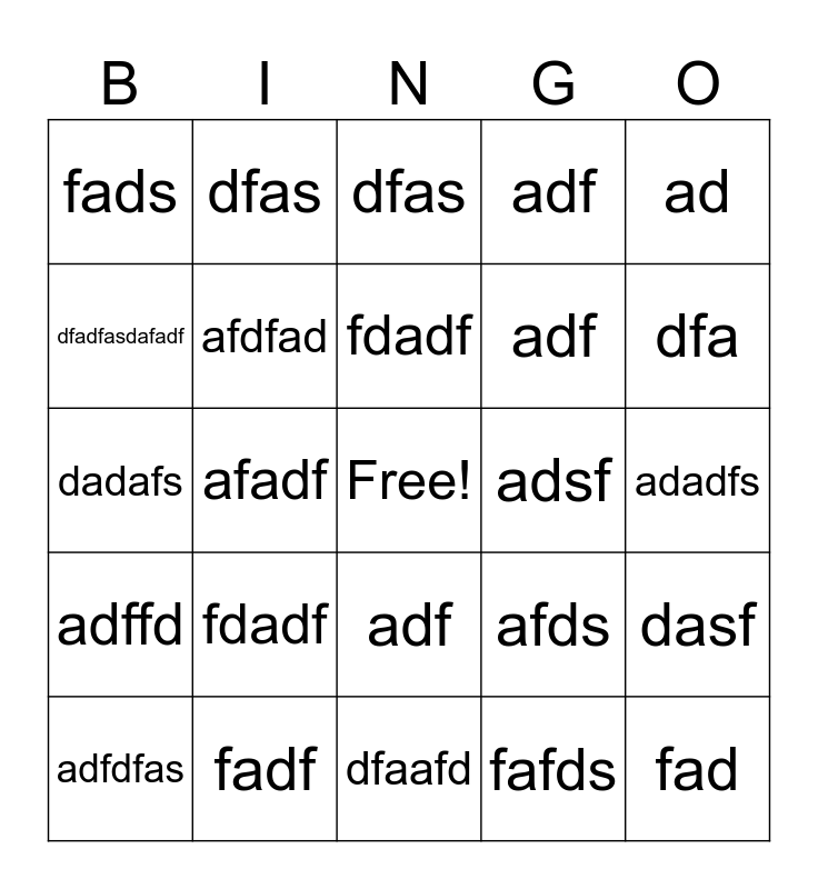 This bingo card has a free space and 24 words: fdadf, fadf, fdadf, adfdfas, ad, fads, dfadfasdafadf, dfas, adsf, adf, adf, dadafs, afds, dasf, afdfad, fafds, adadfs, dfas, dfa, afadf, fad, adffd, adf and dfaafd.