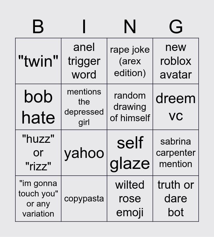 This bingo card has 28 words: deepwoken, random roblox screenshot, "huzz" or "rizz", going out with gf, mentions the depressed girl, rape joke (arex edition), anel trigger word, truth or dare bot, copypasta, tyler, self glaze, new roblox avatar, tf2, redpan selfie, yahoo, crazy life story, "sybau", random drawing of himself, dreem vc, grow a garden, "twin", "fine shyt", "im gonna touch you" or any variation, sabrina carpenter mention, wilted rose emoji, wow mini mention, bob hate and "king".