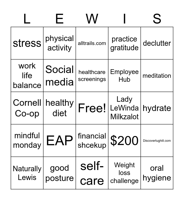 This bingo card has a free space and 28 words: Discovertughill.com, NeoGov, Employee Hub, Weight loss challenge, work life balance, alltrails.com, physical activity, mindful monday, Lady LeWinda Milkzalot, Naturally Lewis, Cornell Co-op, practice gratitude, good posture, self-care, meditation, proper sleep, EAP, Social media, healthcare screenings, financial shcekup, stress, deep breathing, oral hygiene, healthy diet, hydrate, $200, declutter and connect with others.