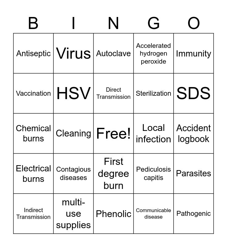 This bingo card has a free space and 53 words: Bacteria, Pathogenic, Nonpathogenic, Communicable disease, Contagious diseases, MRSA, Virus, bacteria, Vaccination, HBV, HSV, HIV, Parasites, Pediculosis capitis, Biofilm, Indirect Transmission, Direct Transmission, Local infection, General Infection, Immunity, Cleaning, Disinfection, Sterilization, Antiseptic, Nonporus tools, multi-use supplies, Contact time, Virucidals, OSHA, SDS, EPA, EPA registration number, Complete immersion, Multiple quats, Contact time, Bleach, Accelerated hydrogen peroxide, Phenolic, Autoclave, Cross-contamination, Blood exposure procedures, PPE, Accident logbook, Good Samaritan laws, Second degree burn, First degree burn, Third degree burn, Patch test, Chemical burns, Electrical burns, Choking, Fainting and Eye injuries.