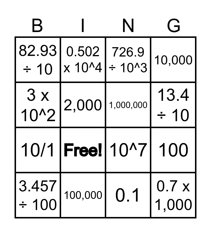 This bingo card has 20 words: 100, 6.07 x 1,000, 726.9 ÷ 10^3, 1,000, 3.457 ÷ 100, 3 x 10^2, 100,000, 82.93 ÷ 10, 10/1, 0.502 x 10^4, Free!, 10^7, 2,000, 0.7 x 1,000, 1,000,000, 2.48 x 10, 13.4 ÷ 10, 10,000, 0.1 and 4 x 10^2.