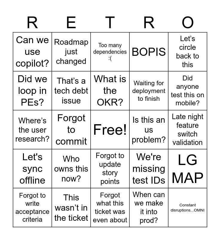 This bingo card has a free space and 24 words: Who owns this now?, This wasn’t in the ticket, What is the OKR?, Forgot to write acceptance criteria, Let’s circle back to this, Can we use copilot?, Did we loop in PEs?, Roadmap just changed, Is this an us problem?, Forgot to update story points, Waiting for deployment to finish, Where’s the user research?, We're missing test IDs, LG MAP, That’s a tech debt issue, When can we make it into prod?, Late night feature switch validation, Too many dependencies :(, Did anyone test this on mobile?, Forgot to commit, Constant disruptions...OMNI, Let's sync offline, BOPIS and Forgot what this ticket was even about.