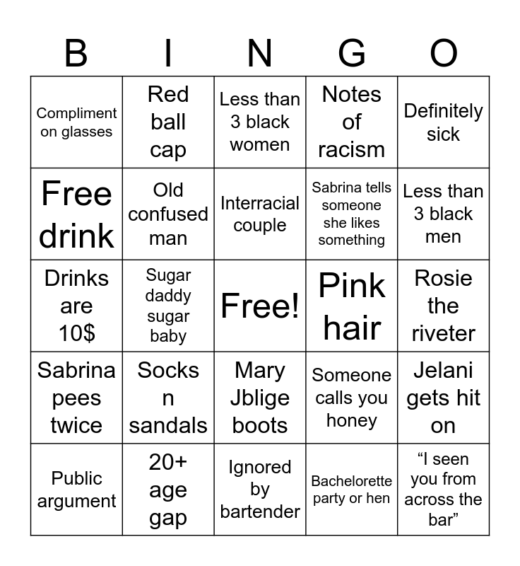 This bingo card has a free space and 24 words: Socks n sandals, 20+ age gap, Interracial couple, Public argument, Definitely sick, Compliment on glasses, Free drink, Red ball cap, Pink hair, Mary Jblige boots, Sabrina tells someone she likes something, Drinks are 10$, Someone calls you honey, Jelani gets hit on, Old confused man, Bachelorette party or hen, Rosie the riveter, Less than 3 black women, Less than 3 black men, Sugar daddy sugar baby, “I seen you from across the bar”, Sabrina pees twice, Notes of racism and Ignored by bartender.