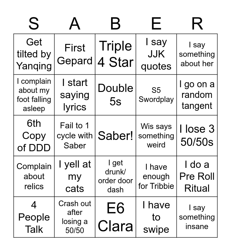 This bingo card has a free space and 24 words: I yell at my cats, Crash out after losing a 50/50, Double 5s, 4 People Talk, I say something about her, Get tilted by Yanqing, I complain about my foot falling asleep, First Gepard, Wis says something weird, I get drunk/ order door dash, S5 Swordplay, 6th Copy of DDD, I have enough for Tribbie, I do a Pre Roll Ritual, I start saying lyrics, I have to swipe, I lose 3 50/50s, Triple 4 Star, I go on a random tangent, Fail to 1 cycle with Saber, I say something insane, Complain about relics, I say JJK quotes and E6 Clara.