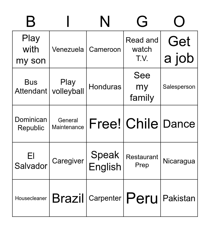 This bingo card has a free space and 24 words: Caregiver, Brazil, Honduras, Housecleaner, Get a job, Play with my son, Bus Attendant, Venezuela, Chile, Speak English, See my family, Dominican Republic, Restaurant Prep, Nicaragua, Play volleyball, Peru, Dance, Cameroon, Salesperson, General Maintenance, Pakistan, El Salvador, Read and watch T.V. and Carpenter.