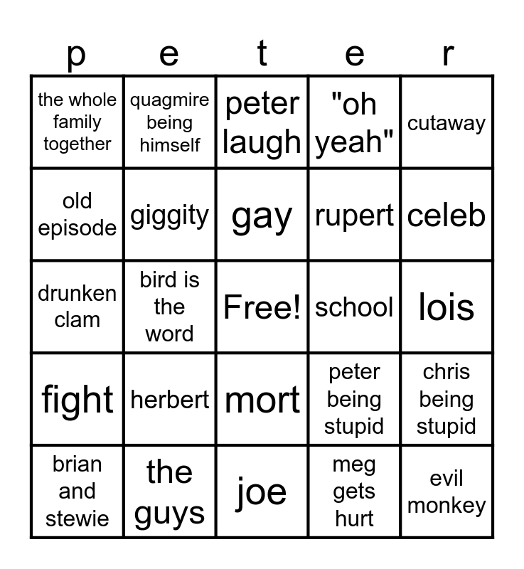 This bingo card has a free space and 24 words: herbert, the guys, gay, brian and stewie, cutaway, the whole family together, old episode, quagmire being himself, school, mort, rupert, drunken clam, peter being stupid, chris being stupid, giggity, meg gets hurt, lois, peter laugh, celeb, bird is the word, evil monkey, fight, "oh yeah" and joe.