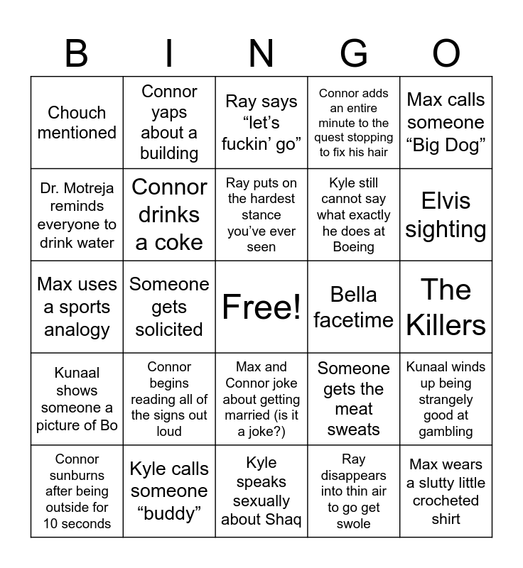 This bingo card has a free space and 24 words: Connor begins reading all of the signs out loud, Kyle calls someone “buddy”, Ray puts on the hardest stance you’ve ever seen, Connor sunburns after being outside for 10 seconds, Max calls someone “Big Dog”, Chouch mentioned, Dr. Motreja reminds everyone to drink water, Connor yaps about a building, Bella facetime, Max and Connor joke about getting married (is it a joke?), Kyle still cannot say what exactly he does at Boeing, Max uses a sports analogy, Someone gets the meat sweats, Kunaal winds up being strangely good at gambling, Connor drinks a coke, Ray disappears into thin air to go get swole, The Killers, Ray says “let’s fuckin’ go”, Elvis sighting, Someone gets solicited, Max wears a slutty little crocheted shirt, Kunaal shows someone a picture of Bo, Connor adds an entire minute to the quest stopping to fix his hair and Kyle speaks sexually about Shaq.