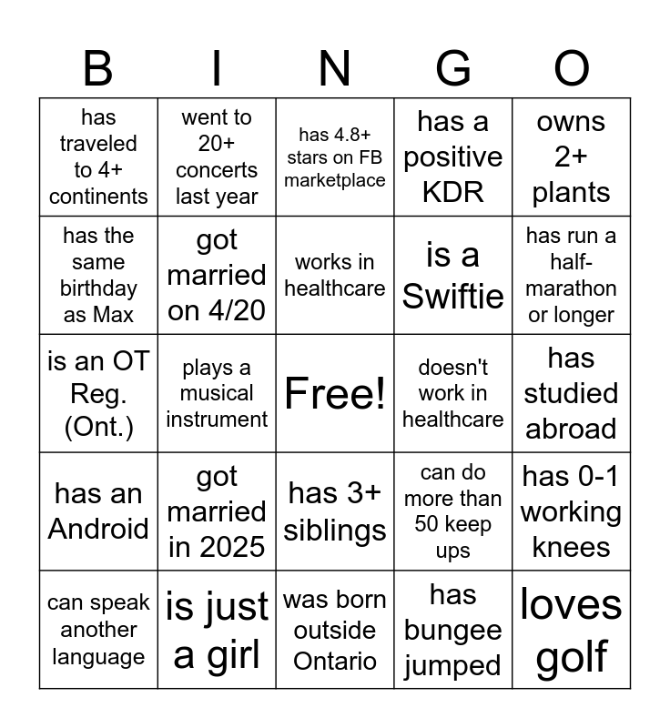 This bingo card has a free space and 46 words: has a dog with the same birthday as leo, loves golf, doesn't drink coffee, was born outside Ontario, got married in 2025, has been to a Raptors game, went to 20+ concerts last year, owns frisbee gloves, has the same birthday as Max, grew up in Sauga, got married on 4/20, has a positive KDR, has 0-1 working knees, can do more than 50 keep ups, has gone through a work midlife crisis, can squat 150 lbs, works in healthcare, doesn't work in healthcare, has brought life into the world, owns 2+ plants, plays a musical instrument, has bungee jumped, has traveled to 4+ continents, is a Swiftie, has fractured their toe, has run a half-marathon or longer, can speak another language, has been to the world's largest McDonald's, has 3+ siblings, has an Android, is left handed, is an engineer, owns a cat, went to undergrad with Max & Christine, has sang in public, is just a girl, has studied abroad, watches reality TV, has travelled with Christine and/or Max, has had traveller's diarrhea, has an Owala, has 4.8+ stars on FB marketplace, is an OT Reg. (Ont.), has a CCFP, is a serial hobbyist and can juggle.