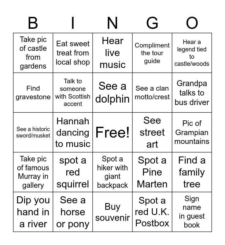 This bingo card has a free space and 24 words: spot a red squirrel, See a horse or pony, See a dolphin, Dip you hand in a river, Hear a legend tied to castle/woods, Take pic of castle from gardens, Find gravestone, Eat sweet treat from local shop, See street art, Spot a hiker with giant backpack, See a clan motto/crest, See a historic sword/musket, Spot a Pine Marten, Find a family tree, Talk to someone with Scottish accent, Spot a red U.K. Postbox, Pic of Grampian mountains, Hear live music, Grandpa talks to bus driver, Hannah dancing to music, Sign name in guest book, Take pic of famous Murray in gallery, Compliment the tour guide and Buy souvenir.