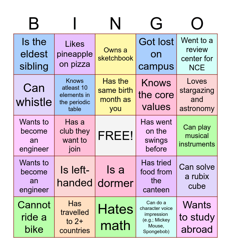 This bingo card has a free space and 24 words: Is left-handed, Has travelled to 2+ countries, Has the same birth month as you, Cannot ride a bike, Went to a review center for NCE, Is the eldest sibling, Can whistle, Likes pineapple on pizza, Has went on the swings before, Is a dormer, Knows the core values, Wants to become an engineer, Has tried food from the canteen, Can solve a rubix cube, Knows atleast 10 elements in the periodic table, Can do a character voice impression (e.g.; Mickey Mouse, Spongebob), Can play musical instruments, Owns a sketchbook, Loves stargazing and astronomy, Has a club they want to join, Wants to study abroad, Wants to become an engineer, Got lost on campus and Hates math.