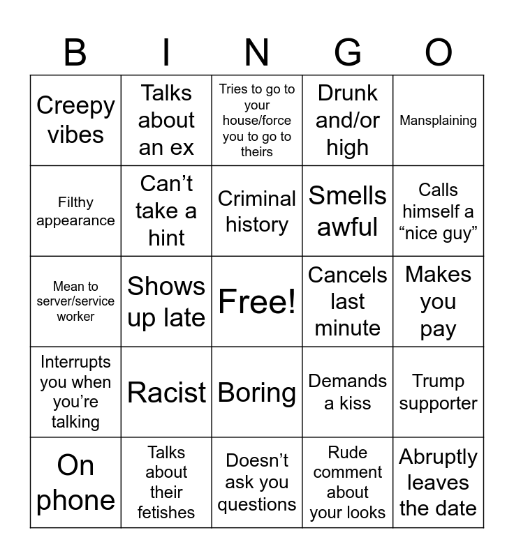 This bingo card has a free space and 24 words: On phone, Racist, Criminal history, Rude comment about your looks, Mansplaining, Creepy vibes, Talks about an ex, Tries to go to your house/force you to go to theirs, Cancels last minute, Makes you pay, Mean to server/service worker, Can’t take a hint, Demands a kiss, Trump supporter, Filthy appearance, Talks about their fetishes, Doesn’t ask you questions, Drunk and/or high, Calls himself a “nice guy”, Interrupts you when you’re talking, Shows up late, Boring, Smells awful and Abruptly leaves the date.