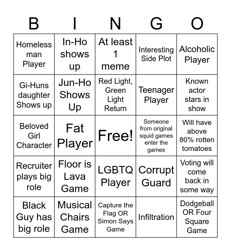 This bingo card has a free space and 24 words: Floor is Lava Game, Musical Chairs Game, Red Light, Green Light Return, Black Guy has big role, Alcoholic Player, Homeless man Player, Gi-Huns daughter Shows up, In-Ho shows up, Someone from original squid games enter the games, LGBTQ Player, Teenager Player, Beloved Girl Character, Corrupt Guard, Voting will come back in some way, Jun-Ho Shows Up, Infiltration, Will have above 80% rotten tomatoes, At least 1 meme, Known actor stars in show, Fat Player, Dodgeball OR Four Square Game, Recruiter plays big role, Interesting Side Plot and Capture the Flag OR Simon Says Game.