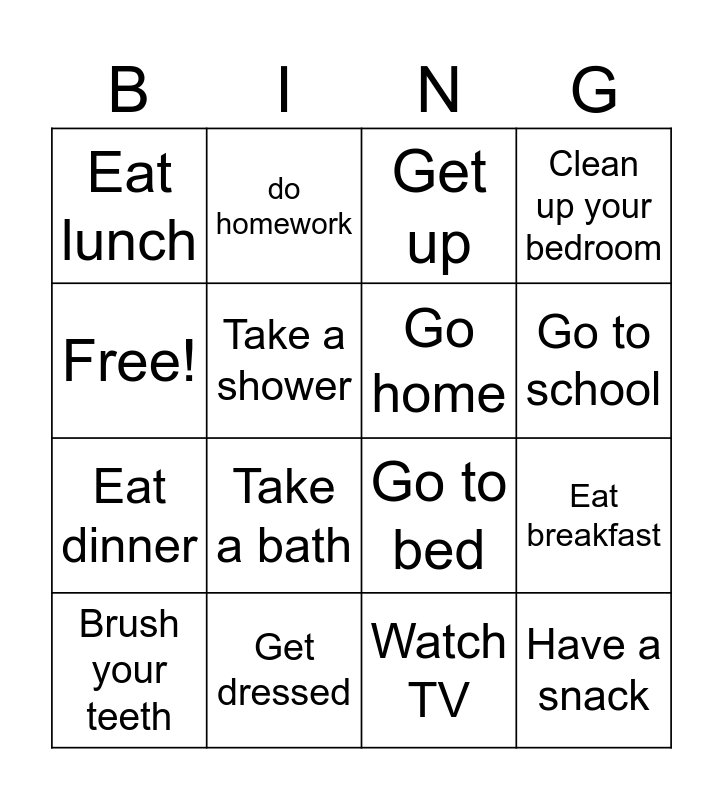 This bingo card has 16 words: Get dressed, Eat breakfast, Get up, Eat lunch, Eat dinner, do homework, Go to bed, Watch TV, Free!, Take a shower, Brush your teeth, Clean up your bedroom, Take a bath, Go to school, Go home and Have a snack.