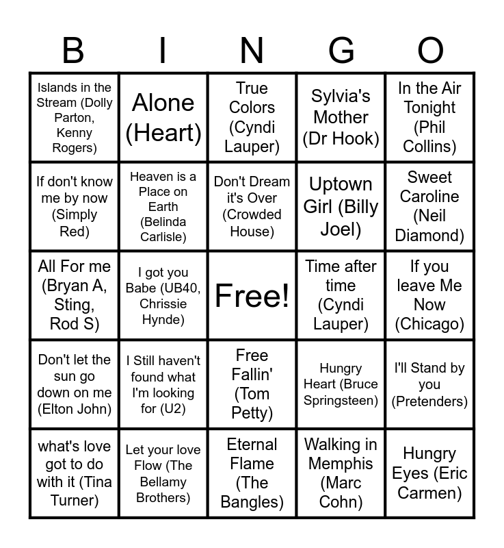 This bingo card has a free space and 35 words: Sad Songs Say So Much (Elton John), Don't Go Breaking My Heart (Elton John, Kiki Dee), Knock Three Times (Tony Orlando & Dawn), Heaven is a Place on Earth (Belinda Carlisle), Free Fallin' (Tom Petty), Sylvia's Mother (Dr Hook), If don't know me by now (Simply Red), Everything I do (Bryan Adams), Don't Dream it's Over (Crowded House), Wonderful Tonight (Eric Clapton), All For me (Bryan A, Sting, Rod S), In the Air Tonight (Phil Collins), Weather with you (Crowded House), I want to break free (Queen), Islands in the Stream (Dolly Parton, Kenny Rogers), Time after time (Cyndi Lauper), Walking in Memphis (Marc Cohn), I got you Babe (UB40, Chrissie Hynde), Don't let the sun go down on me (Elton John), Hungry Eyes (Eric Carmen), Hungry Heart (Bruce Springsteen), what's love got to do with it (Tina Turner), I'll Stand by you (Pretenders), Let your love Flow (The Bellamy Brothers), True Colors (Cyndi Lauper), Sweet Caroline (Neil Diamond), I want it that Way (Backstreet Boys), Total Eclipse of the Heart (Bonnie Tyler), Uptown Girl (Billy Joel), If you leave Me Now (Chicago), Candle in the wind (Elton John), Eternal Flame (The Bangles), I Still haven't found what I'm looking for (U2), Alone (Heart) and Green Green Grass of Home (Tom Johns).