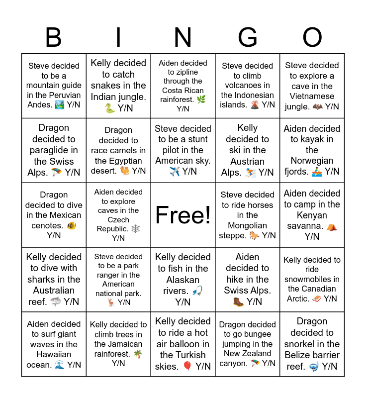 This bingo card has a free space and 34 words: Kelly decided to snowboard in the Swiss Alps. ποΈ Y/N, Dragon decided to go bungee jumping in the New Zealand canyon. πͺ Y/N, Steve decided to become a firefighter in the Canadian forest. π₯ Y/N, Aiden decided to skydive in the Brazilian rainforest. π³ Y/N, Kelly decided to dive with sharks in the Australian reef. π¦ Y/N, Dragon decided to race camels in the Egyptian desert. π« Y/N, Steve decided to explore a cave in the Vietnamese jungle. π¦ Y/N, Aiden decided to surf giant waves in the Hawaiian ocean. π Y/N, Kelly decided to catch snakes in the Indian jungle. π Y/N, Dragon decided to walk on ice in the Russian tundra. βοΈ Y/N, Steve decided to be a stunt pilot in the American sky. βοΈ Y/N, Aiden decided to zipline through the Costa Rican rainforest. πΏ Y/N, Kelly decided to be a volcano tour guide in the Italian mountains. π Y/N, Dragon decided to ski down the French Alps. πΏ Y/N, Steve decided to ride horses in the Mongolian steppe. π Y/N, Aiden decided to kayak in the Norwegian fjords. π£ββοΈ Y/N, Kelly decided to climb trees in the Jamaican rainforest. π΄ Y/N, Dragon decided to dive in the Mexican cenotes. π Y/N, Steve decided to be a park ranger in the American national park. π¦ Y/N, Aiden decided to hike in the Swiss Alps. π₯Ύ Y/N, Kelly decided to fish in the Alaskan rivers. π£ Y/N, Dragon decided to snowboard in the Japanese mountains. π Y/N, Steve decided to be a mountain guide in the Peruvian Andes. ποΈ Y/N, Aiden decided to camp in the Kenyan savanna. βΊ Y/N, Kelly decided to ride a hot air balloon in the Turkish skies. π Y/N, Dragon decided to snorkel in the Belize barrier reef. π€Ώ Y/N, Steve decided to climb volcanoes in the Indonesian islands. π Y/N, Aiden decided to ride elephants in the Thai jungle. π Y/N, Kelly decided to ski in the Austrian Alps. β·οΈ Y/N, Dragon decided to paraglide in the Swiss Alps. πͺ Y/N, Steve decided to dive in the Great Barrier Reef. π Y/N, Aiden decided to explore caves in the Czech Republic. πΈοΈ Y/N, Kelly decided to ride snowmobiles in the Canadian Arctic. π· Y/N and Dragon decided to sail in the Greek islands. β΅ Y/N.