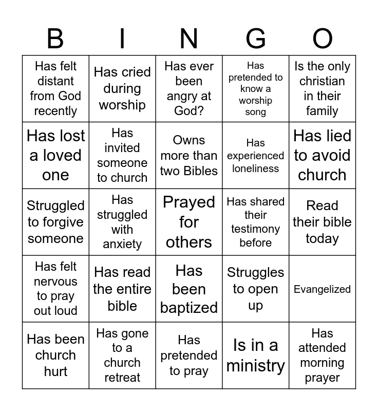 This bingo card has a free space and 24 words: Has read the entire bible, Has gone to a church retreat, Owns more than two Bibles, Has been church hurt, Is the only christian in their family, Has felt distant from God recently, Has lost a loved one, Has cried during worship, Has shared their testimony before, Has been baptized, Has experienced loneliness, Struggled to forgive someone, Struggles to open up, Evangelized, Has invited someone to church, Is in a ministry, Read their bible today, Has ever been angry at God?, Has lied to avoid church, Has struggled with anxiety, Has attended morning prayer, Has felt nervous to pray out loud, Has pretended to know a worship song and Has pretended to pray.