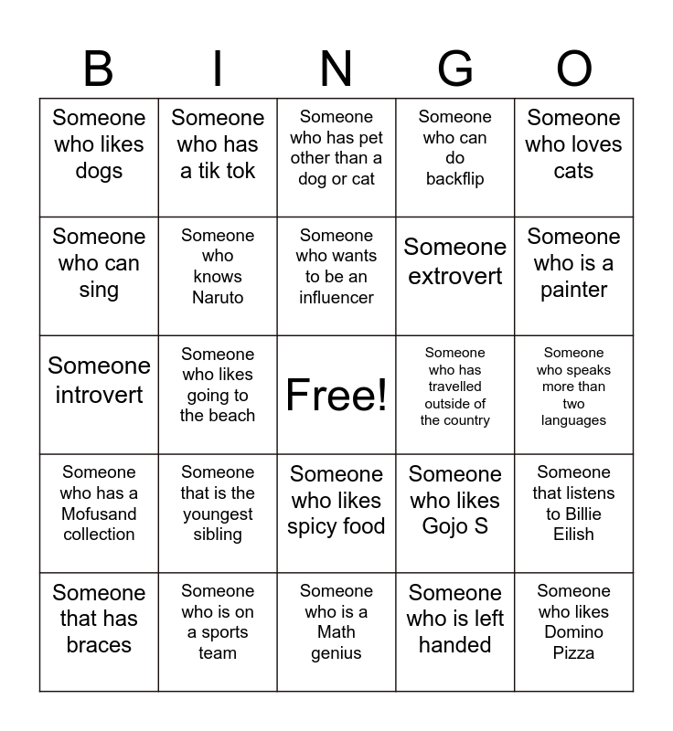 This bingo card has a free space and 24 words: Someone that has braces, Someone that is the youngest sibling, Someone who wants to be an influencer, Someone who is left handed, Someone who loves cats, Someone who likes dogs, Someone who has a tik tok, Someone who has pet other than a dog or cat, Someone who has travelled outside of the country, Someone who speaks more than two languages, Someone introvert, Someone who knows Naruto, Someone who likes Gojo S, Someone that listens to Billie Eilish, Someone who can sing, Someone who is on a sports team, Someone who is a Math genius, Someone who can do backflip, Someone who is a painter, Someone who has a Mofusand collection, Someone who likes going to the beach, Someone who likes spicy food, Someone extrovert and Someone who likes Domino Pizza.