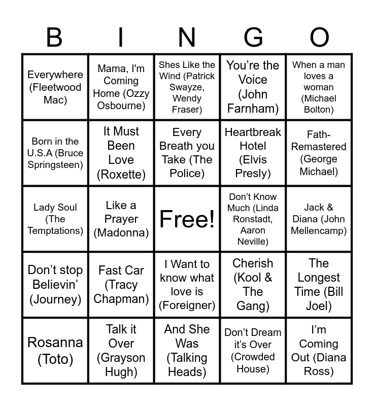 This bingo card has a free space and 35 words: The Best (Tina Turner), You Sang to Me (Marc Anthony), You win Again (Bee Gees), It Must Been Love (Roxette), I Want to know what love is (Foreigner), You’re the Voice (John Farnham), Born in the U.S.A (Bruce Springsteen), Say I Love You (Renee Geyer), Every Breath you Take (The Police), You can call Me Al (Paul Simon), Lady Soul (The Temptations), When a man loves a woman (Michael Bolton), Slow Hands (The Pointer Sisters), Walk Of Life (Dire Straits), Everywhere (Fleetwood Mac), Don’t Know Much (Linda Ronstadt, Aaron Neville), Don’t Dream it’s Over (Crowded House), Like a Prayer (Madonna), Don’t stop Believin’ (Journey), I’m Coming Out (Diana Ross), Cherish (Kool & The Gang), Rosanna (Toto), The Longest Time (Bill Joel), Talk it Over (Grayson Hugh), Shes Like the Wind (Patrick Swayze, Wendy Fraser), Fath- Remastered (George Michael), Two Out of the three ain't Bad Meat Loaf), All for Love (Rod Stewart), Heartbreak Hotel (Elvis Presly), Jack & Diana (John Mellencamp), Raspberry Beret (Prince), And She Was (Talking Heads), Fast Car (Tracy Chapman), Mama, I'm Coming Home (Ozzy Osbourne) and Tennessee Whiskey.