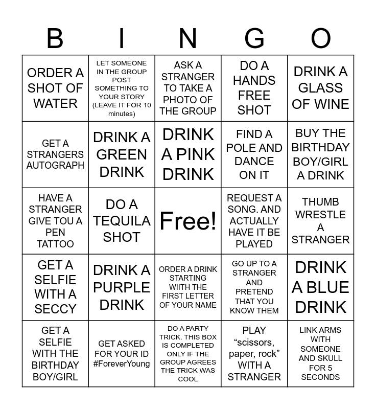 This bingo card has a free space and 37 words: DRINK A RED DRINK, DRINK AN ORANGE DRINK, DRINK A YELLOW DRINK, DRINK A GREEN DRINK, DRINK A BLUE DRINK, DRINK A PURPLE DRINK, DRINK A PINK DRINK, DRINK A BEER, DRINK A GLASS OF WINE, DRINK A COCKTAIL, DO A TEQUILA SHOT, DO A HANDS FREE SHOT, LINK ARMS WITH SOMEONE AND SKULL FOR 5 SECONDS, THUMB WRESTLE A STRANGER, GET A STRANGERS AUTOGRAPH, GET A SELFIE WITH A SECCY, HAVE A STRANGER HOLD YOUR GLASS WHILE YOU TAKE A SIP, ASK A STRANGER TO TAKE A PHOTO OF THE GROUP, ORDER A DRINK STARTING WIITH THE FIRST LETTER OF YOUR NAME, REQUEST A SONG. AND ACTUALLY HAVE IT BE PLAYED, ORDER A SHOT OF WATER, BUY THE BIRTHDAY BOY/GIRL A DRINK, GET A SELFIE WITH THE BIRTHDAY BOY/GIRL, DO A PARTY TRICK. THIS BOX IS COMPLETED ONLY IF THE GROUP AGREES THE TRICK WAS COOL, GIVE A STRANGER A COMPLEMENT, PLAY “scissors, paper, rock” WITH A STRANGER, LET SOMEONE IN THE GROUP POST SOMETHING TO YOUR STORY (LEAVE IT FOR 10 minutes), MAKE A TOAST, SING HAPPY BIRTHDAY TO SOMEONE IN THE GROUP, GIVE A STRANGER A COMPLEMENT, STEAL A GLASS FROM A VENUE, GET ASKED FOR YOUR ID #ForeverYoung, HAVE A STRANGER GIVE TOU A PEN TATTOO, TELL THE BARTENDER “I’M ALLOWED TO GET A SWEET TREAT TODAY” BEFORE ORDERING YOUR DRINK, GO UP TO A STRANGER AND PRETEND THAT YOU KNOW THEM, FIND A POLE AND DANCE ON IT and SKILL YOUR DRINK FOR 10 SECONDS.