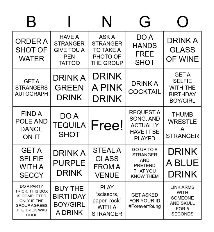 This bingo card has a free space and 38 words: DRINK A RED DRINK, DRINK AN ORANGE DRINK, DRINK A YELLOW DRINK, DRINK A GREEN DRINK, DRINK A BLUE DRINK, DRINK A PURPLE DRINK, DRINK A PINK DRINK, DRINK A BEER, DRINK A GLASS OF WINE, DRINK A COCKTAIL, DO A TEQUILA SHOT, DO A HANDS FREE SHOT, LINK ARMS WITH SOMEONE AND SKULL FOR 5 SECONDS, THUMB WRESTLE A STRANGER, GET A STRANGERS AUTOGRAPH, GET A SELFIE WITH A SECCY, HAVE A STRANGER HOLD YOUR GLASS WHILE YOU TAKE A SIP, ASK A STRANGER TO TAKE A PHOTO OF THE GROUP, ORDER A DRINK STARTING WIITH THE FIRST LETTER OF YOUR NAME, REQUEST A SONG. AND ACTUALLY HAVE IT BE PLAYED, ORDER A SHOT OF WATER, BUY THE BIRTHDAY BOY/GIRL A DRINK, GET A SELFIE WITH THE BIRTHDAY BOY/GIRL, DO A PARTY TRICK. THIS BOX IS COMPLETED ONLY IF THE GROUP AGREES THE TRICK WAS COOL, GIVE A STRANGER A COMPLEMENT, PLAY “scissors, paper, rock” WITH A STRANGER, LET SOMEONE IN THE GROUP POST SOMETHING TO YOUR STORY (LEAVE IT FOR 10 minutes), MAKE A TOAST, SING HAPPY BIRTHDAY TO SOMEONE IN THE GROUP, TELL A STRANGER A FUN FACT, TELL A STRANGER A CORNY JOKE, STEAL A GLASS FROM A VENUE, GET ASKED FOR YOUR ID #ForeverYoung, HAVE A STRANGER GIVE TOU A PEN TATTOO, TELL THE BARTENDER “I’M ALLOWED TO GET A SWEET TREAT TODAY” BEFORE ORDERING YOUR DRINK, GO UP TO A STRANGER AND PRETEND THAT YOU KNOW THEM, FIND A POLE AND DANCE ON IT and SKILL YOUR DRINK FOR 10 SECONDS.