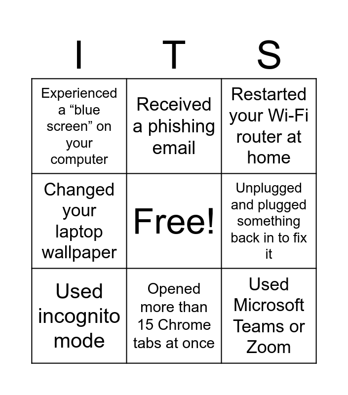 This bingo card has a free space and 12 words: Forgotten your password, Helped someone fix their computer, Used Microsoft Teams or Zoom, Unplugged and plugged something back in to fix it, Received a phishing email, Restarted your Wi-Fi router at home, Opened more than 15 Chrome tabs at once, Used ChatGPT or AI assistant, Experienced a “blue screen” on your computer, Changed your laptop wallpaper, Used incognito mode and Played a tech-based game (e.g. Roblox, Minecraft).