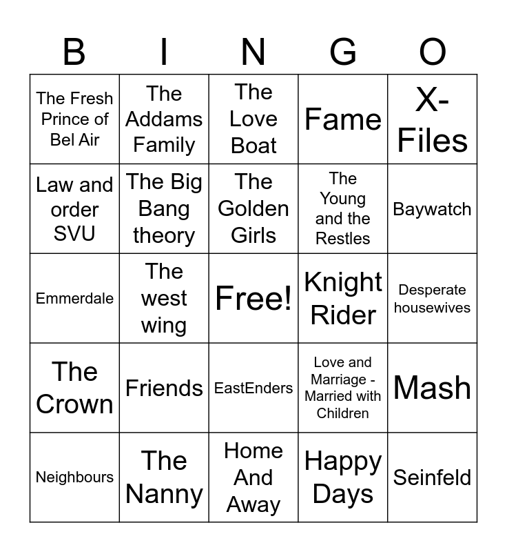 This bingo card has a free space and 25 words: Friends, Home And Away, The Golden Girls, Neighbours, X-Files, The Fresh Prince of Bel Air, Law and order SVU, The Addams Family, Knight Rider, EastEnders, The Young and the Restles, Emmerdale, Love and Marriage - Married with Children, Mash, The Big Bang theory, The Simpsons, Desperate housewives, The Love Boat, Baywatch, The west wing, Seinfeld, The Nanny, The Crown, Fame and Happy Days.