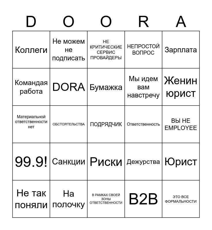 This bingo card has a free space and 24 words: Санкции, На полочку, Бумажка, Не так поняли, Зарплата, Коллеги, Командая работа, Не можем не подписать, Ответственность, Риски, Мы идем вам навстречу, Материальной ответственности нет, Дежурства, Юрист, DORA, B2B, ВЫ НЕ EMPLOYEE, НЕ КРИТИЧЕСКИЕ СЕРВИС ПРОВАЙДЕРЫ, Женин юрист, ОБСТОЯТЕЛЬСТВА, ЭТО ВСЕ ФОРМАЛЬНОСТИ, 99.9!, НЕПРОСТОЙ ВОПРОС and В РАМКАХ СВОЕЙ ЗОНЫ ОТВЕТСТВЕННОСТИ.
