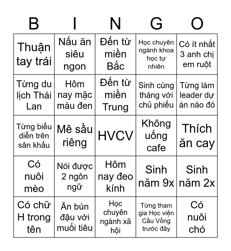 This bingo card has a free space and 24 words: Nói được 2 ngôn ngữ, Ăn bún đậu với muối tiêu, Đến từ miền Trung, Có chữ H trong tên, Có ít nhất 3 anh chị em ruột, Thuận tay trái, Từng du lịch Thái Lan, Nấu ăn siêu ngon, Không uống cafe, Hôm nay đeo kính, Sinh cùng tháng với chủ phiếu, Từng biểu diễn trên sân khấu, Sinh năm 9x, Sinh năm 2x, Hôm nay mặc màu đen, Từng tham gia Học viện Cầu Vồng trước đây, Thích ăn cay, Đến từ miền Bắc, Từng làm leader dự án nào đó, Mê sầu riêng, Có nuôi chó, Có nuôi mèo, Học chuyên ngành khoa học tự nhiên and Học chuyên ngành xã hội.