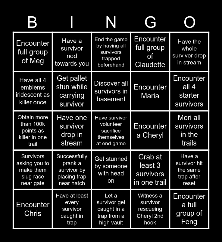 This bingo card has a free space and 24 words: Successfully prank a survivor by placing trap near hatch, Have at least every survivor caught in trap, Discover all survivors in basement, Encounter Chris, Have the whole survivor drop in stream, Encounter full group of Meg, Have all 4 emblems iridescent as killer once, Have a survivor nod towards you, Encounter a Cheryl, Get stunned by someone with head on, Encounter Maria, Obtain more than 100k points as killer in one trail, Grab at least 3 survivors in one trail, Have a survivor hit the same trap after reset, Get pallet stun while carrying survivor, Witness a survivor rescueing Cheryl 2nd hook, Mori all survivors in the trails, End the game by having all survivors trapped beforehand, Encounter all 4 starter survivors, Have one survivor drop in stream, Encounter a full group of Feng, Survivors asking you to make them slug race near gate, Encounter full group of Claudette and Let a survivor get caught in a trap from a high vault.