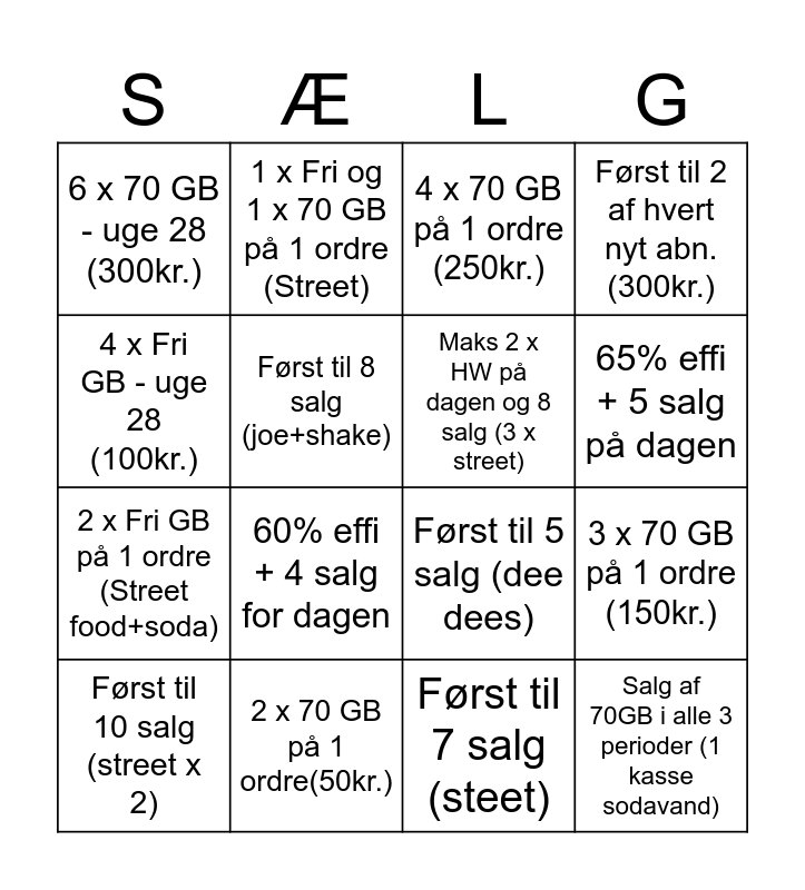 This bingo card has 16 words: 2 x 70 GB på 1 ordre(50kr.), 3 x 70 GB på 1 ordre (150kr.), 4 x 70 GB på 1 ordre (250kr.), 6 x 70 GB - uge 28 (300kr.), 2 x Fri GB på 1 ordre (Street food+soda), 1 x Fri og 1 x 70 GB på 1 ordre (Street), Først til 5 salg (dee dees), Først til 7 salg (steet), 4 x Fri GB - uge 28 (100kr.), Først til 8 salg (joe+shake), Først til 10 salg (street x 2), Først til 2 af hvert nyt abn. (300kr.), 60% effi + 4 salg for dagen, 65% effi + 5 salg på dagen, Maks 2 x HW på dagen og 8 salg (3 x street) and Salg af 70GB i alle 3 perioder (1 kasse sodavand).