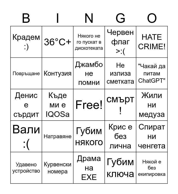 This bingo card has a free space and 24 words: Удавено устройство, Натравяне, Джамбо не помни, Губим ключа, HATE CRIME!, Крадем :), 36°C+, Някого не го пускат в дискотеката, смърт !, Жили ни медуза, Денис е сърдит, Контузия, Крис е без лична, Спират ни ченгета, Повръщане, Курвенски номера, Драма на EXE, Червен флаг >:(, "Чакай да питам ChatGPT", Вали :(, Къде ми е IQOSа, Губим някого, Не излиза сметката and Някой е без екипировка.