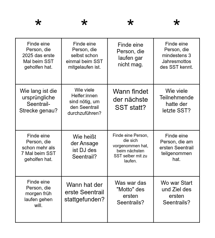 This bingo card has 16 words: Wann hat der erste Seentrail stattgefunden?, Finde eine Person, die am ersten Seentrail teilgenommen hat., Finde eine Person, die laufen gar nicht mag., Finde eine Person, die 2025 das erste Mal beim SST geholfen hat., Finde eine Person, die schon mehr als 7 Mal beim SST geholfen hat., Finde eine Person, die selbst schon einmal beim SST mitgelaufen ist., Finde eine Person, die sich vorgenommen hat, beim nächsten SST selber mit zu laufen., Was war das "Motto" des ersten Seentrails?, Wie lang ist die ursprüngliche Seentrail-Strecke genau?, Wie viele Helfer:innen sind nötig, um den Seentrail durchzuführen?, Finde eine Person, die morgen früh laufen gehen will., Finde eine Person, die mindestens 3 Jahresmottos des SST kennt., Wie heißt der Ansage ist DJ des Seentrail?, Wie viele Teilnehmende hatte der letzte SST?, Wann findet der nächste SST statt? and Wo war Start und Ziel des ersten Seentrails?.