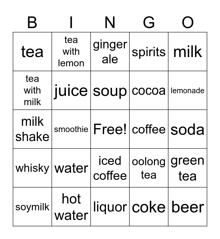 This bingo card has a free space and 24 words: water, hot water, soup, soymilk, milk, tea, tea with milk, tea with lemon, coffee, iced coffee, cocoa, milk shake, oolong tea, green tea, juice, coke, soda, ginger ale, lemonade, smoothie, beer, whisky, spirits and liquor.