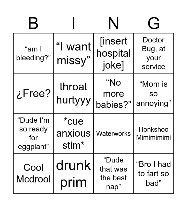 This bingo card has 16 words: drunk prim, Honkshoo Mimimimimi, [insert hospital joke], “am I bleeding?”, “Dude I’m so ready for eggplant”, “I want missy”, Waterworks, “Dude that was the best nap”, ¿Free?, throat hurtyyy, Cool Mcdrool, Doctor Bug, at your service, *cue anxious stim*, “Mom is so annoying”, “No more babies?” and “Bro I had to fart so bad”.
