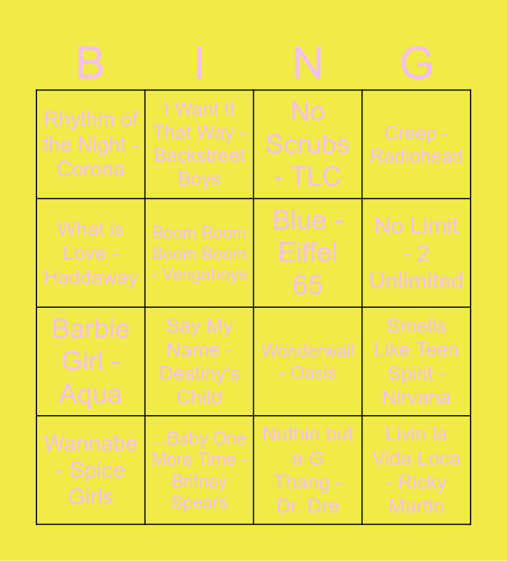 This bingo card has 16 words: ...Baby One More Time - Britney Spears, Smells Like Teen Spirit - Nirvana, No Scrubs - TLC, Rhythm of the Night - Corona, Barbie Girl - Aqua, I Want It That Way - Backstreet Boys, Wonderwall - Oasis, Nuthin but a G Thang - Dr. Dre, What is Love - Haddaway, Boom Boom Boom Boom - Vengaboys, Wannabe - Spice Girls, Creep - Radiohead, Say My Name - Destiny's Child, No Limit - 2 Unlimited, Blue - Eiffel 65 and Livin la Vida Loca - Ricky Martin.