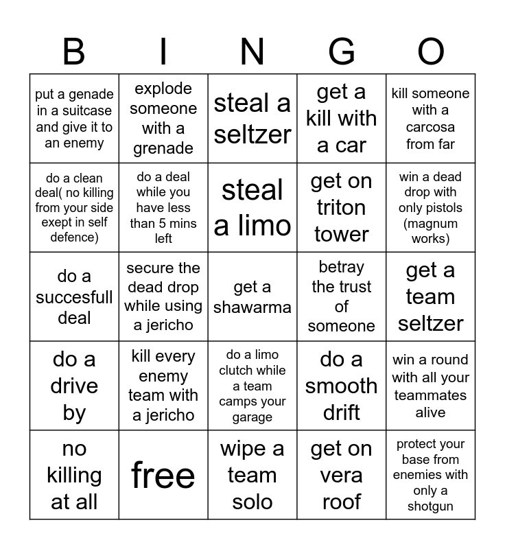 This bingo card has a free space and 24 words: kill every enemy team with a jericho, free, steal a limo, no killing at all, kill someone with a carcosa from far, put a genade in a suitcase and give it to an enemy, do a clean deal( no killing from your side exept in self defence), explode someone with a grenade, betray the trust of someone, do a limo clutch while a team camps your garage, get on triton tower, do a succesfull deal, do a smooth drift, win a round with all your teammates alive, do a deal while you have less than 5 mins left, get on vera roof, get a team seltzer, steal a seltzer, win a dead drop with only pistols (magnum works), secure the dead drop while using a jericho, protect your base from enemies with only a shotgun, do a drive by, get a kill with a car and wipe a team solo.
