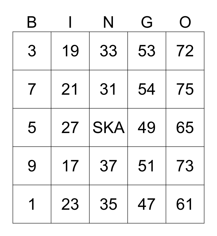This bingo card has a free space and 24 words: 1, 17, 31, 47, 72, 3, 19, 33, 49, 65, 5, 21, 51, 73, 7, 23, 35, 53, 75, 9, 27, 37, 54 and 61.