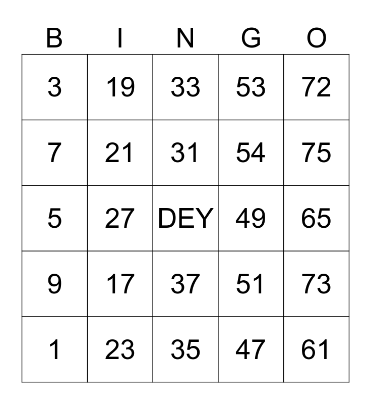 This bingo card has a free space and 24 words: 1, 17, 31, 47, 72, 3, 19, 33, 49, 65, 5, 21, 51, 73, 7, 23, 35, 53, 75, 9, 27, 37, 54 and 61.
