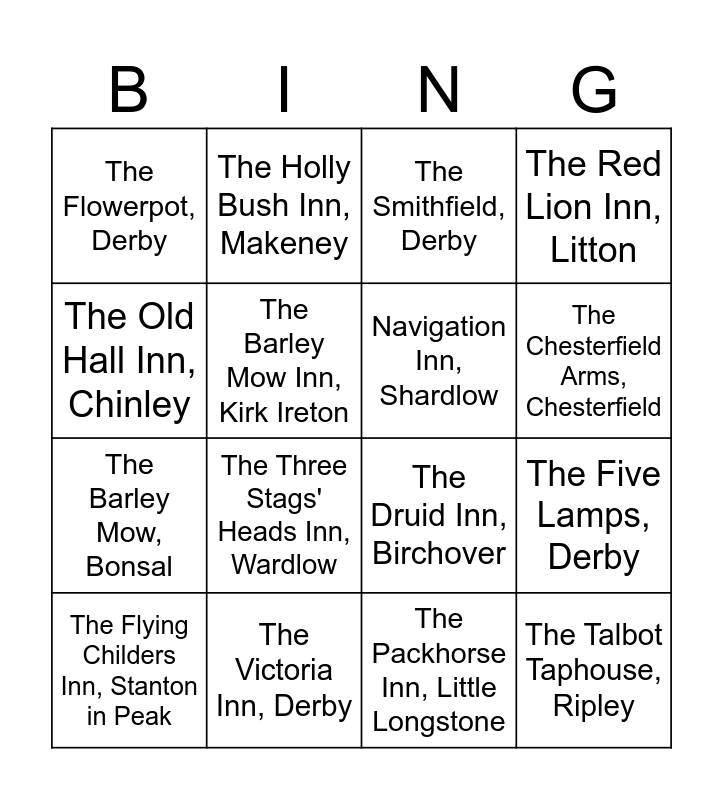 This bingo card has 16 words: The Victoria Inn, Derby, The Five Lamps, Derby, The Smithfield, Derby, The Flowerpot, Derby, The Barley Mow, Bonsal, The Holly Bush Inn, Makeney, The Druid Inn, Birchover, The Packhorse Inn, Little Longstone, The Old Hall Inn, Chinley, The Barley Mow Inn, Kirk Ireton, The Flying Childers Inn, Stanton in Peak, The Red Lion Inn, Litton, The Three Stags' Heads Inn, Wardlow, The Chesterfield Arms, Chesterfield, Navigation Inn, Shardlow and The Talbot Taphouse, Ripley.