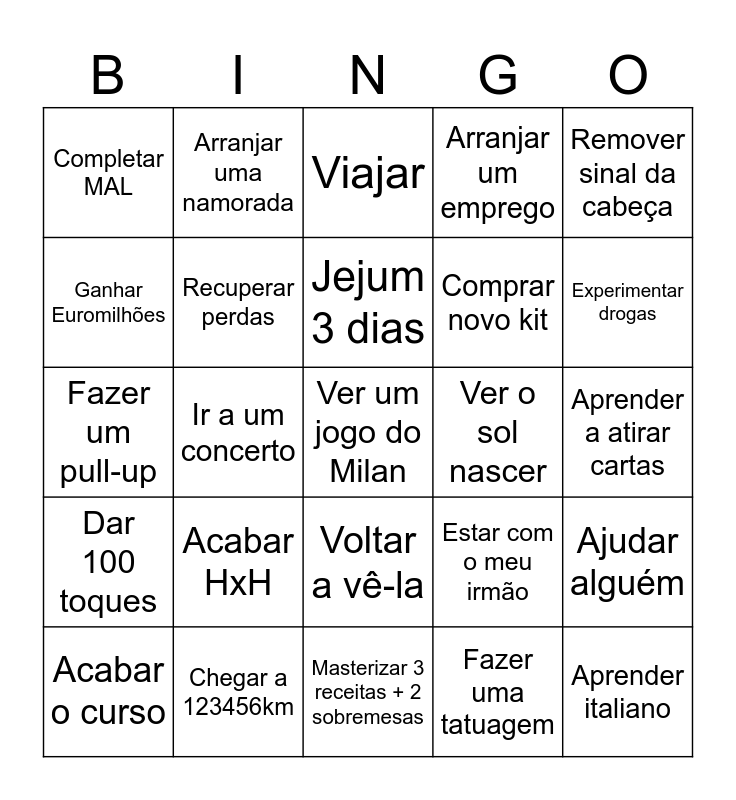 This bingo card has 25 words: Acabar HxH, Masterizar 3 receitas + 2 sobremesas, Jejum 3 dias, Acabar o curso, Remover sinal da cabeça, Completar MAL, Ganhar Euromilhões, Arranjar uma namorada, Ver o sol nascer, Voltar a vê-la, Comprar novo kit, Fazer um pull-up, Estar com o meu irmão, Ajudar alguém, Recuperar perdas, Aprender italiano, Aprender a atirar cartas, Viajar, Experimentar drogas, Ir a um concerto, Ver um jogo do Milan, Chegar a 123456km, Dar 100 toques, Arranjar um emprego and Fazer uma tatuagem.
