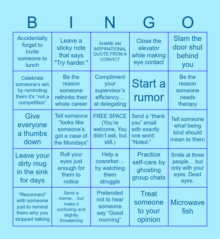This bingo card has a free space and 24 words: Roll your eyes just enough for them to notice, Send a meme… but make it confusing and slightly threatening, Compliment your supervisor’s efficiency… at delegating, “Reconnect” with someone just to remind them why you stopped talking, Slam the door shut behind you, Accidentally forget to invite someone to lunch, Celebrate someone’s win by reminding them it’s “not a competition”, Leave a sticky note that says "Try harder.", Send a “thank you” email with exactly one word: “Noted.”, Help a coworker… by watching them struggle, Start a rumor, Give everyone a thumbs down, Practice self-care by ghosting group chats, Smile at three people… but only with your eyes. Dead eyes., Be the reason someone rethinks their whole career, Treat someone to your opinion, Tell someone what being kind should mean to them, SHARE AN INSPIRATIONAL QUOTE FROM A CONVICT, Be the reason someone needs therapy, Tell someone “looks like someone’s got a case of the Mondays”, Microwave fish, Leave your dirty mug in the sink for days, Close the elevator while making eye contact and Pretended not to hear someone say “Good morning”.