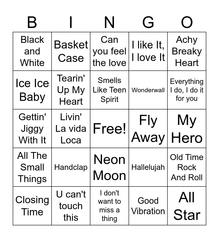 This bingo card has a free space and 24 words: Handclap, U can't touch this, Smells Like Teen Spirit, Closing Time, Achy Breaky Heart, Black and White, Ice Ice Baby, Basket Case, Fly Away, Neon Moon, Wonderwall, Gettin' Jiggy With It, Hallelujah, Old Time Rock And Roll, Tearin' Up My Heart, Good Vibration, My Hero, Can you feel the love, Everything I do, I do it for you, Livin' La vida Loca, All Star, All The Small Things, I like It, I love It and I don't want to miss a thing.