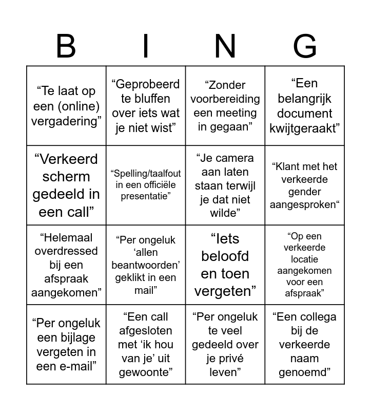 This bingo card has 18 words: “Per ongeluk ‘allen beantwoorden’ geklikt in een mail”, “Een collega bij de verkeerde naam genoemd”, “Zonder voorbereiding een meeting in gegaan”, “Te laat op een (online) vergadering”, “Iets beloofd en toen vergeten”, “Een belangrijk document kwijtgeraakt”, “Per ongeluk een bijlage vergeten in een e-mail”, “Geprobeerd te bluffen over iets wat je niet wist”, “Klant met het verkeerde gender aangesproken“, “Helemaal overdressed bij een afspraak aangekomen”, “Per ongeluk te veel gedeeld over je privé leven”, “Verkeerd scherm gedeeld in een call”, “Op een verkeerde locatie aangekomen voor een afspraak”, “Spelling/taalfout in een officiële presentatie”, “Je camera aan laten staan terwijl je dat niet wilde”, “Je microfoon wel aan laten staan terwijl je dacht dat hij uit stond”, “Een call afgesloten met ‘ik hou van je’ uit gewoonte” and “Te veel informatie gedeeld tijdens een voorstelrondje”.