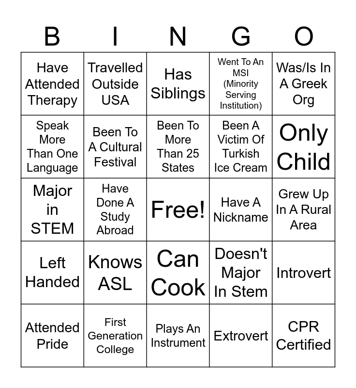 This bingo card has a free space and 24 words: Knows ASL, First Generation College, Been To More Than 25 States, Attended Pride, Was/Is In A Greek Org, Have Attended Therapy, Speak More Than One Language, Travelled Outside USA, Have A Nickname, Can Cook, Been A Victim Of Turkish Ice Cream, Major in STEM, Doesn't Major In Stem, Introvert, Been To A Cultural Festival, Extrovert, Grew Up In A Rural Area, Has Siblings, Only Child, Have Done A Study Abroad, CPR Certified, Left Handed, Went To An MSI (Minority Serving Institution) and Plays An Instrument.