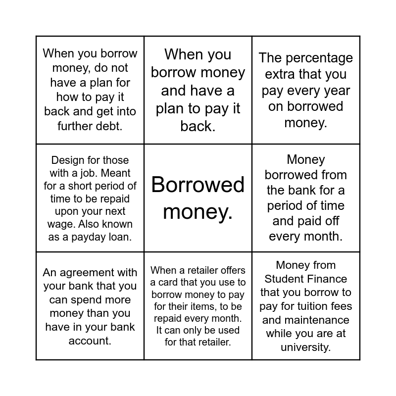 This bingo card has 16 words: Free!, The amount you pay back on top of your loan., The percentage extra that you pay every year on borrowed money., When you borrow money, do not have a plan for how to pay it back and get into further debt., Money from Student Finance that you borrow to pay for tuition fees and maintenance while you are at university., When you borrow money and have a plan to pay it back., When you owe money., A plan for the steps you can take to repay debt., Borrowed money., Money borrowed from the bank for a period of time and paid off every month., When an item is paid for weekly ot mnthly until the full amount and interest are paid, and the item is owned., Design for those with a job. Meant for a short period of time to be repaid upon your next wage. Also known as a payday loan., A card from a bank that uses borrowed money to pay for things. This is repaid every month., When a retailer offers a card that you use to borrow money to pay for their items, to be repaid every month. It can only be used for that retailer., An agreement with your bank that you can spend more money than you have in your bank account. and A number showing how reliable you are at paying back money..