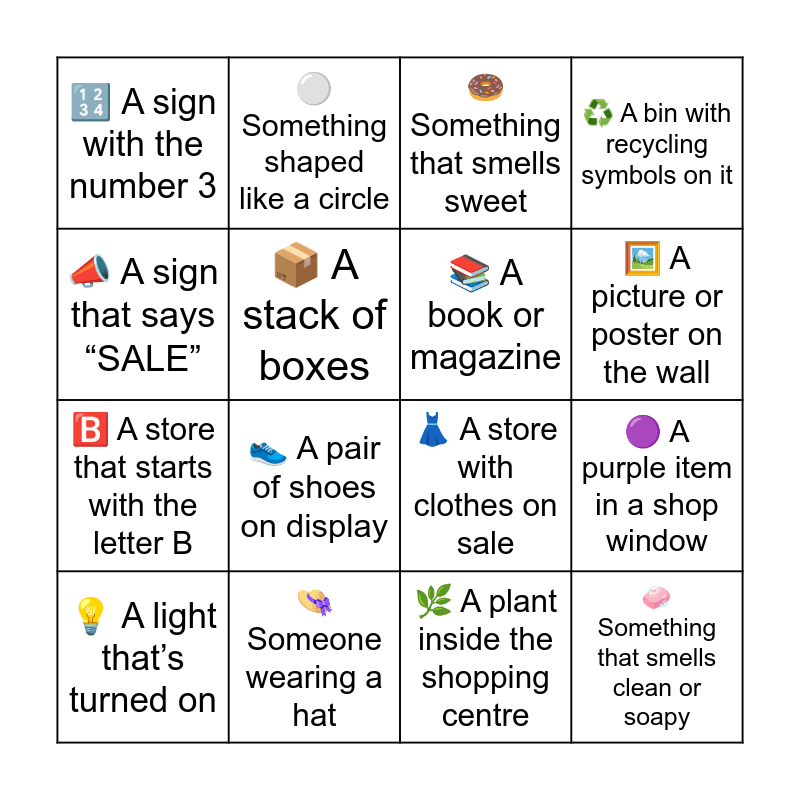 This bingo card has 16 words: π Someone wearing a hat, π£ A purple item in a shop window, π© Something that smells sweet, π’ A sign with the number 3, π ±οΈ A store that starts with the letter B, βͺ Something shaped like a circle, π A store with clothes on sale, πΏ A plant inside the shopping centre, π£ A sign that says βSALEβ, π¦ A stack of boxes, π‘ A light thatβs turned on, β»οΈ A bin with recycling symbols on it, π A pair of shoes on display, πΌ A picture or poster on the wall, π A book or magazine and π§Ό Something that smells clean or soapy.