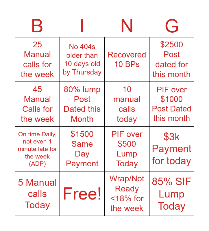This bingo card has 16 words: Free!, $3k Payment for today, Recovered 10 BPs, 25 Manual calls for the week, On time Daily, not even 1 minute late for the week (ADP), No 404s older than 10 days old by Thursday, PIF over $500 Lump Today, Wrap/Not Ready <18% for the week, 45 Manual Calls for the week, 80% lump Post Dated this Month, 5 Manual calls Today, $2500 Post dated for this month, $1500 Same Day Payment, PIF over $1000 Post Dated this month, 10 manual calls today and 85% SIF Lump Today.