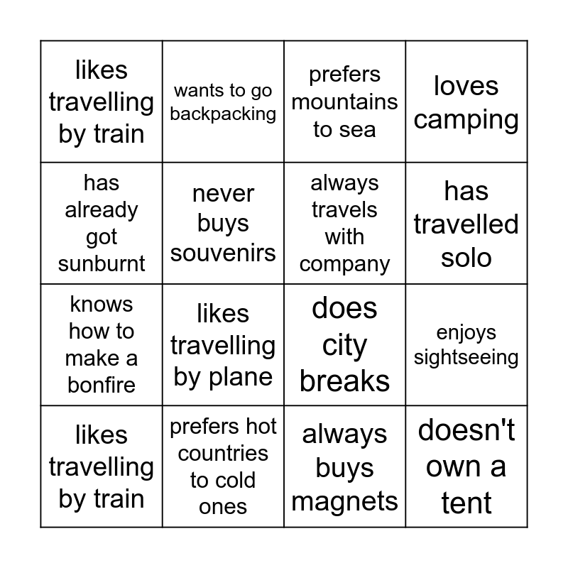 This bingo card has 16 words: prefers hot countries to cold ones, enjoys sightseeing, prefers mountains to sea, likes travelling by train, knows how to make a bonfire, wants to go backpacking, does city breaks, always buys magnets, has already got sunburnt, never buys souvenirs, likes travelling by train, loves camping, likes travelling by plane, has travelled solo, always travels with company and doesn't own a tent.