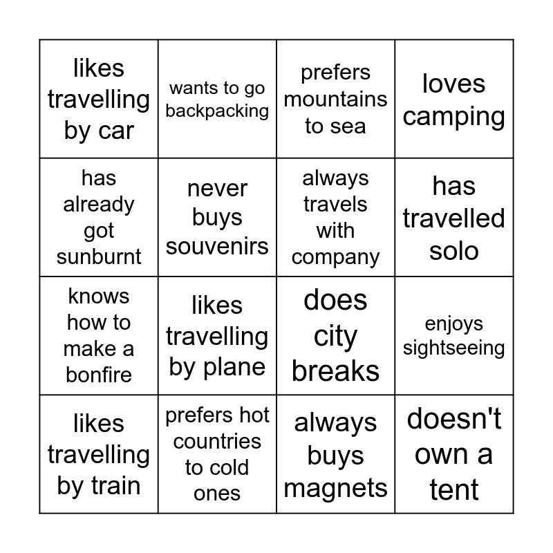 This bingo card has 16 words: prefers hot countries to cold ones, enjoys sightseeing, prefers mountains to sea, likes travelling by car, knows how to make a bonfire, wants to go backpacking, does city breaks, always buys magnets, has already got sunburnt, never buys souvenirs, likes travelling by train, loves camping, likes travelling by plane, has travelled solo, always travels with company and doesn't own a tent.