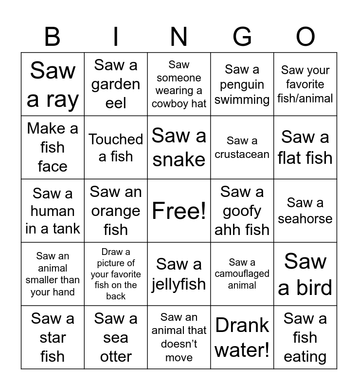 This bingo card has a free space and 29 words: Saw a star fish, Saw a mammal, Saw an orange fish, A fish with a color in its name, Saw a ray, Saw someone wearing a cowboy hat, Touched a fish, Draw a picture of your favorite fish on the back, Saw a goofy ahh fish, Saw a sea otter, Saw a seahorse, Saw a fish eating, Saw an animal that doesn’t move, Drank water!, Saw a flat fish, Saw a shrimp, Saw a jellyfish, Saw an animal smaller than your hand, Saw your favorite fish/animal, Saw a human in a tank, Saw a camouflaged animal, Saw a cat fish, Saw a crustacean, Make a fish face, Saw a penguin swimming, Saw a garden eel, Saw a bird, Saw a snake and Saw an octopus.